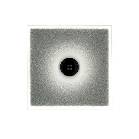 Plastic button, pencil, and metallic thread on rag paper.